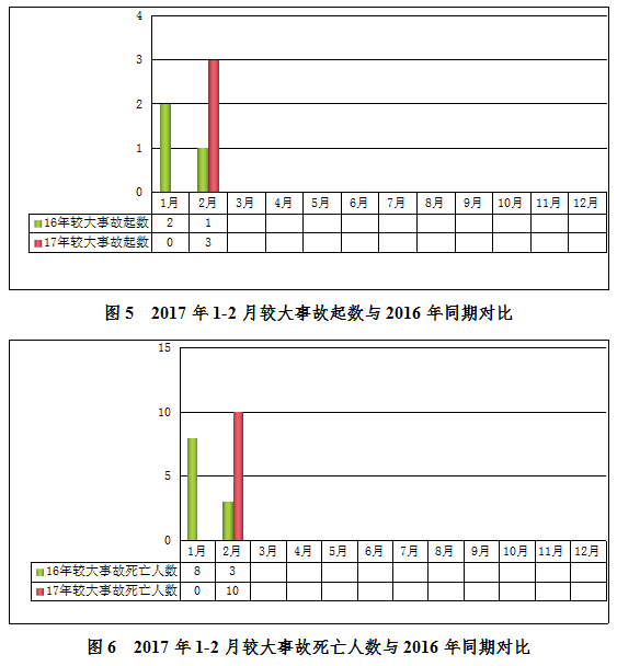 2017年1-2月,全国共发生房屋市政工程生产安全较大事故3起、死亡10人,与去年同期事故起数持平,死亡人数减少1人、同比下降9.09%(见图5、图6)。