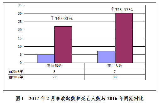 2017年2月,全国共发生房屋市政工程生产安全事故22起、死亡30人,比去年同期事故起数增加17起、死亡人数增加23人,同比分别上升340.00%和328.57%(见图1)。