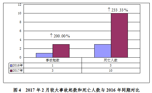 2017年2月,全国共发生房屋市政工程生产安全较大事故3起、死亡10人,比去年同期事故起数增加2起、死亡人数增加7人,同比分别上升200.00%和233.33%(见图4)。
