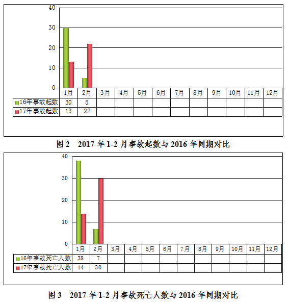 2017年1-2月,全国共发生房屋市政工程生产安全事故35起、死亡44人,与去年同期事故起数持平,死亡人数减少1人,下降2.22%(见图2、图3)。